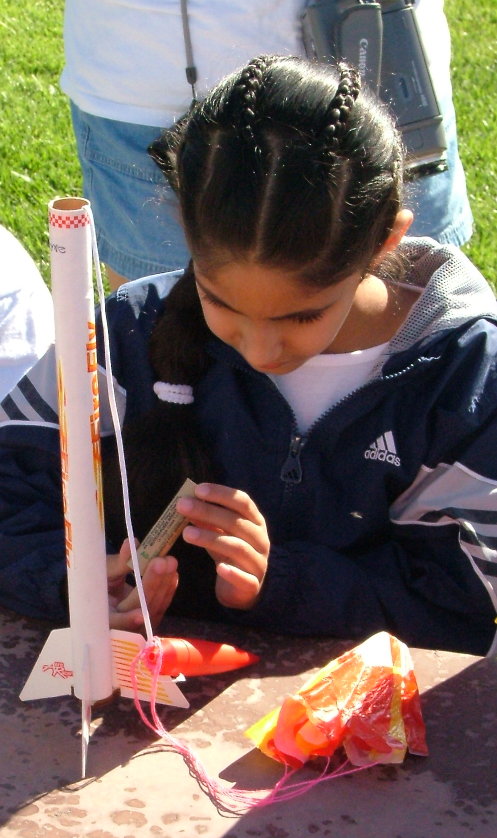 We set up four model rocket pads near the Northwest corner of the field to accommodate the moderate morning wind. Approximately fifteen young rocketeers arrived with a smaller compliment of parents and helpers. The students had all assembled Fireflies (looked like Estes, but no mfg. ID) as a part of the camp activities. Great creativity was demonstrated by the students in the construction of the rockets particularly in the area of fin orientation and location as well as the inclusion (or omission) of various optional items such as launch lugs and motor tubes.