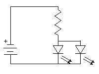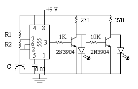 Building the CircuitWhen building IC circuits, breadboard them first to check the wiring and component values before soldering them together on some perfboard. or a printed circuit (PC) board. Unless you really know what you are doing, use a socket for the IC so you don't damage it with heat from the soldering iron or with static electricity. A single static spark damages most ICs. CMOS ICs are especially vulnerable. When soldering a transistor, put a heat sink (clamp or forceps) between the transistor and where you are soldering to protect the transistor. Alternating FlashersIf you want two alternating flashers, such that when one is on the other is off, you can do so with a single 555 and two LEDs or with a 555 and two transistors, one inverting and the other not. The circuit shown below drives two LEDs with the output of the 555. When the output of the 555 is low, current flows through the upper LED turning it on. When the output of the 555 is high, current flows through the lower LED.