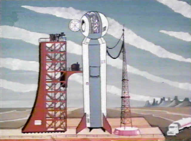 As mentioned at the beginning, the film 2001 was having a tremendous impact on the popular image of spaceships at the time. We can see by this example that the influence had filtered down to the Saturday morning cartoon level. The ship is quite obviously a caricature of the Discovery from that film. The round crew sphere at the front, with it’s curved “slit” window followed by a conical transition section to a long and comparatively thin propulsion section is unmistakable. Of course, the business end back by the tail was rendered more like a 4th of July skyrocket.
